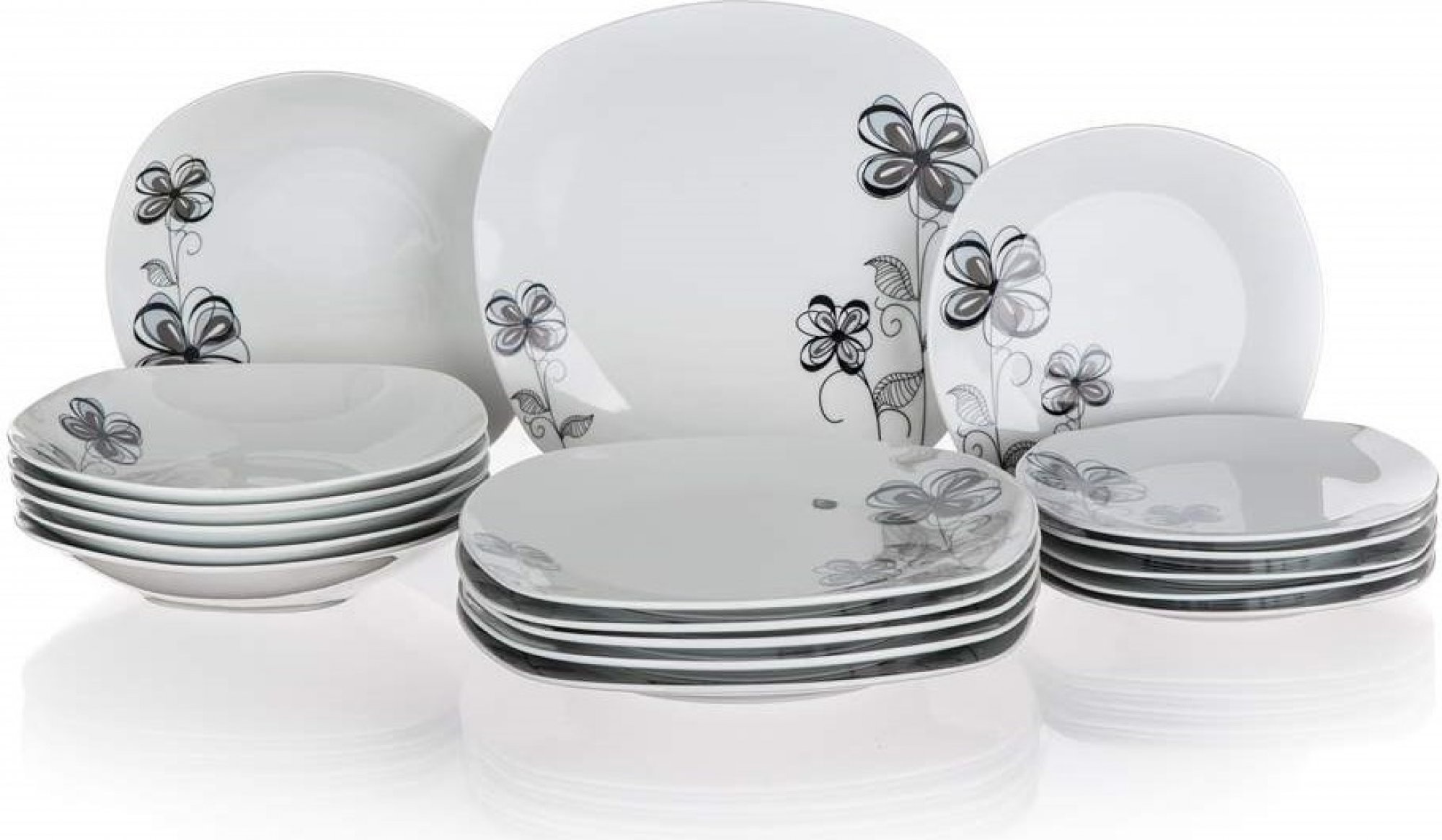 Jedálenská porcelánová súprava 18 okrúhlych tanierov v jednoduchom modernom dizajne na krásne stolovanie. Biela farba, jemný dekor kvetov v čiernej a žltej farbe po stranách....